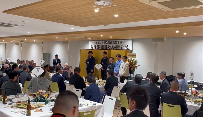 令和7年に、久我山高校野球部は創部80周年を迎え、これを祝し、記念パーティーを國學院大學たまプラーザキャンパス内「ヒルトップ」で、令和7年12月7日(日)に盛大に開催しました。当日は、幅広い世代の野球部OB・OGをはじめ、國清英明校長をはじめ歴代校長、尾崎監督と歴代監督が出席、久我山会からは吉田将卓会長にもご臨席いただき、会場は熱気と笑顔に包まれました。